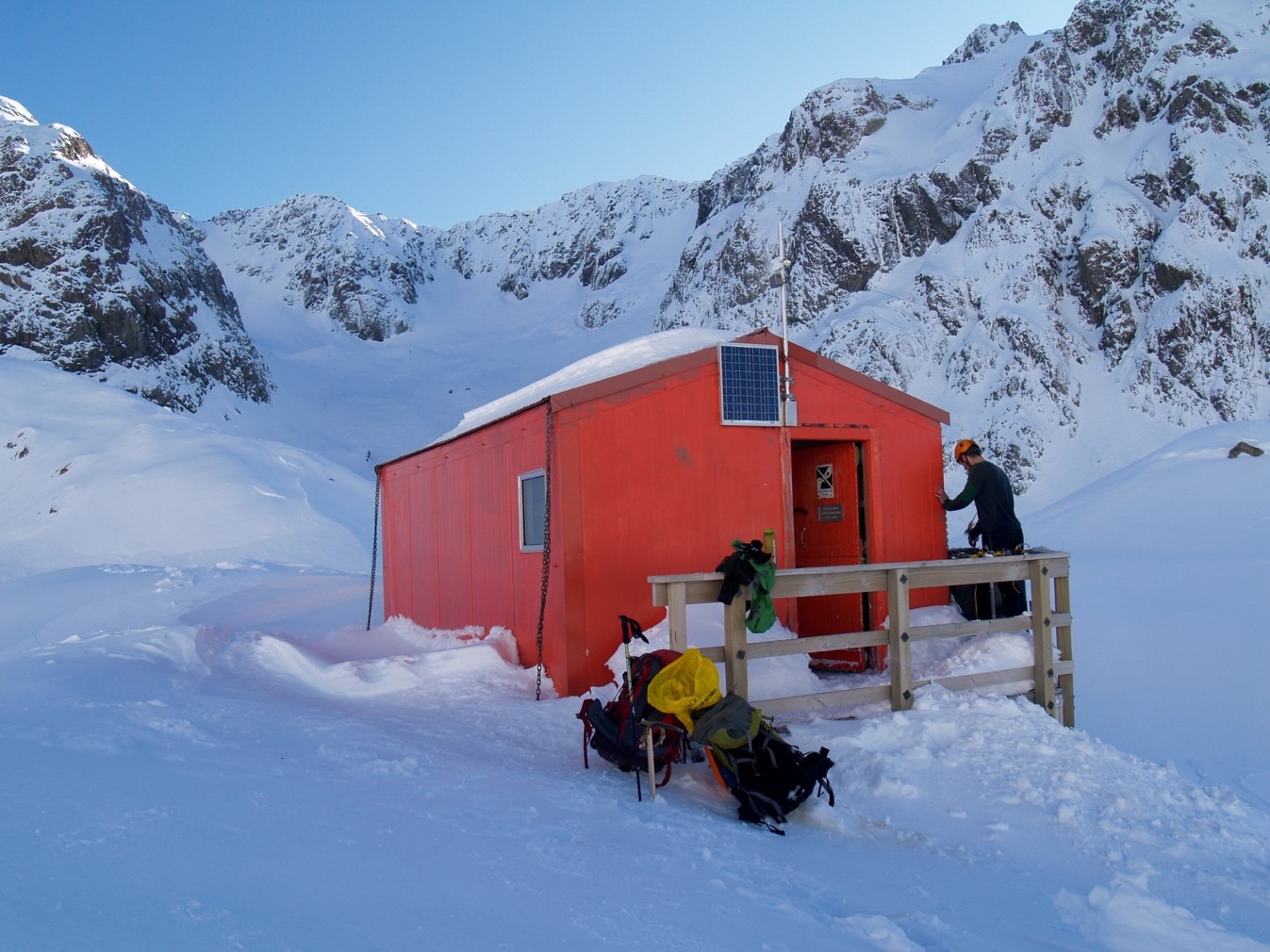 Three of us hopped into our sleeping bags at the early hour of 4pm- at least they will be warm by the time we go to sleep! The brave Hamish with his non suffering dry warm snow boots decided to check out the route up to Mt Murchison while it was still light and pug in some tracks. While Hamish was hard at work the rest of us played find the avalanche transceiver in the hut which didn’t quite work… too many metal things around… Quick peaks of the incredible winter sunset were made by those brave enough venture out into the very cold and clear alpine night. Kate even had to put crampons on to get to the toilet. Not many places you stay you have to do that haha.