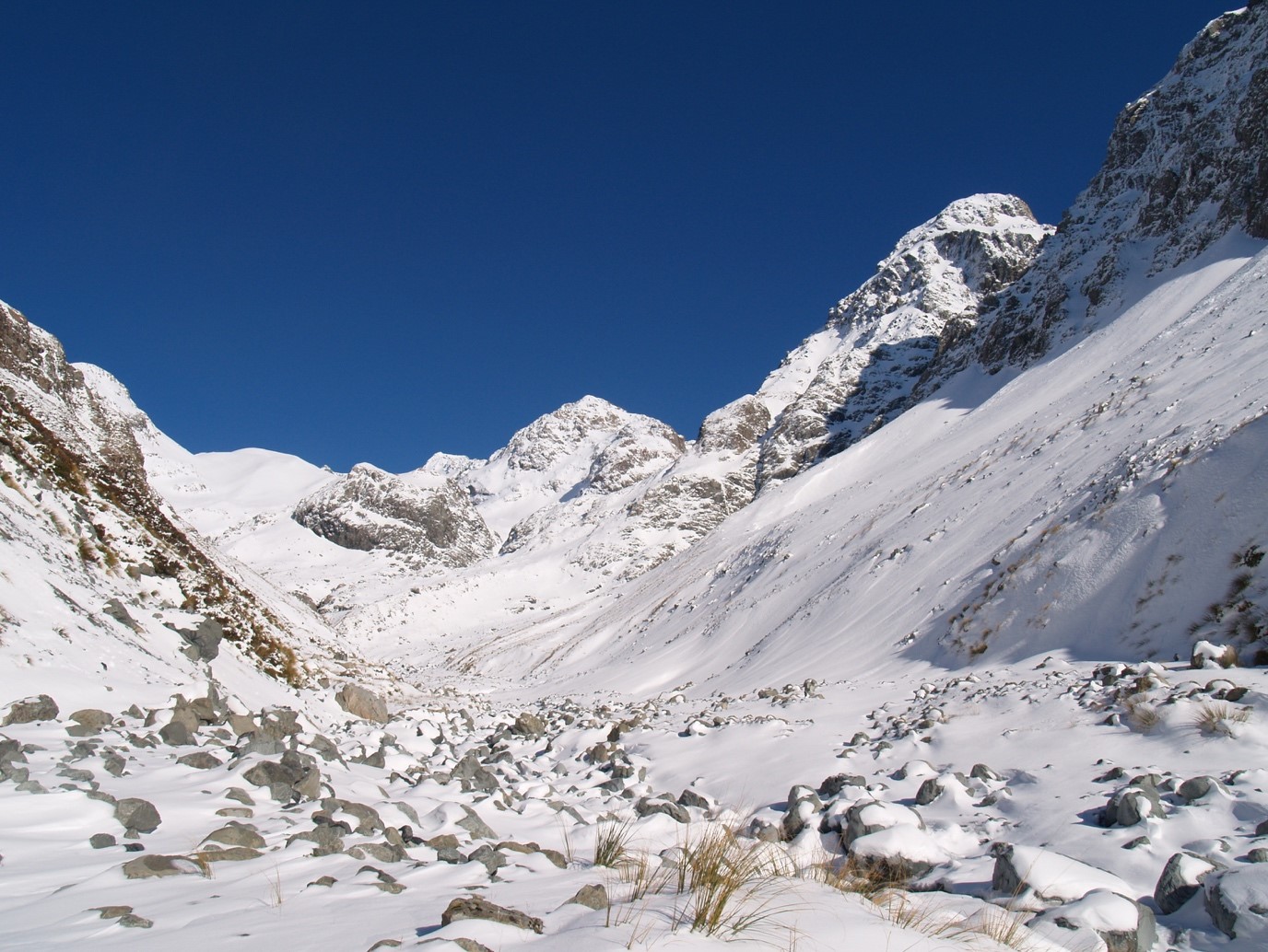 We all hit rather deep snow just after leaving before heading out to the river bed again where the crisp morning air would refreeze our gaiters straight after crossing the river. I had been part way up the White River before in Autumn however with all the snow it was a completely different place, a winter wonderland that sparkled in the warm morning sun. There were huge snow flakes/ frost crystals in the valley which were quite usual and parts of the river had frozen alongside the banks.