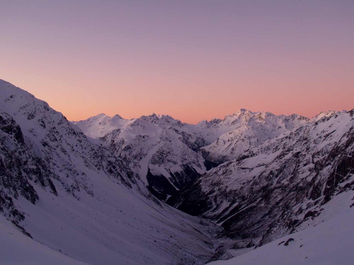 Carrington hut was very big and very cold and very empty. With a hot drink and sleeping bags lofting we gradually warmed amongst the -10°C air temperature surroundings. Up nice an early, Barkers Hut up the White River was the destination. As the horizon lightened, the clear sky came alive and we got the first view of how low the snow was. It had filled the Waimak valley as far as we could see. Absolutely beautiful and a unique view of Mt Rolleston was visible from the hut.
