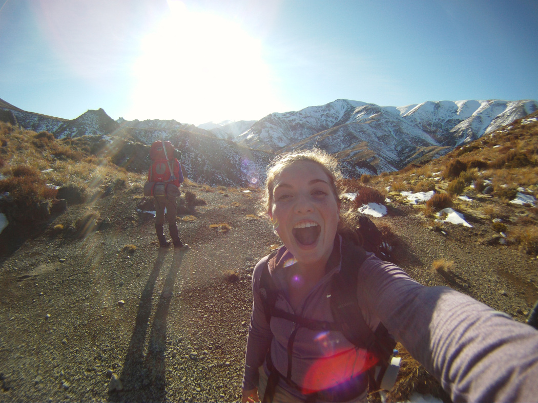 Saturday: Met in the car park at 8 am and loaded up the vans to drive about 1.5 hours to the bottom of the trail. The weather was BEAUTIFUL. The sky was a clear blue which was a wonderful break from constant cloudy skies and chances of rain. We hiked for about 3.5 hours before stopping for lunch. We had just emerged from the woods so we took advantage of a big rock in the sun to warm up and relax. After regrouping, we were back on the trail and got to the Woolshed Hut just as the sun set behind the mountains. The sunset as we travelled up the last incline was breathtaking! Almost all New Zealand trails have “huts” along them – these are buildings with a few bunks to sleep on, some tables to relax at, an outhouse, and some running water. We weren’t so lucky with the pipes on this trip though, they were frozen! The amazing thing: we could fill up our water bottles from the streams without having to worry about contaminated water! It was really cool to see an environment so unharmed from human interaction. My group was the last one to make it to the hut, and by the time we arrived there was a growing tent village just across a stream from the hut (there were about 55 of us from the club on this trip!). My group joined in and pitched our tents before heading to the hut to cook up some much needed warm food – my cooking group made couscous with carrots and salami! Before we knew it the wind started to violently blow and the trip leaders were telling us all to check our tents and their stability. My tentmates and I went out, put some heavy rocks on our stakes to keep everything in place, then headed back to the warmth. As the night drew on the wind grew stronger and when we finally decided to go to bed we discovered that one of our tent poles had broken! Back to the hut we went…. and we were not the only ones. There weren’t enough bunks for everyone who was affected by the great winds, so we all grabbed some floor space and dozed off into some much needed sleep – frequently interrupted by the sound of a monstrous wind attacking the hut.