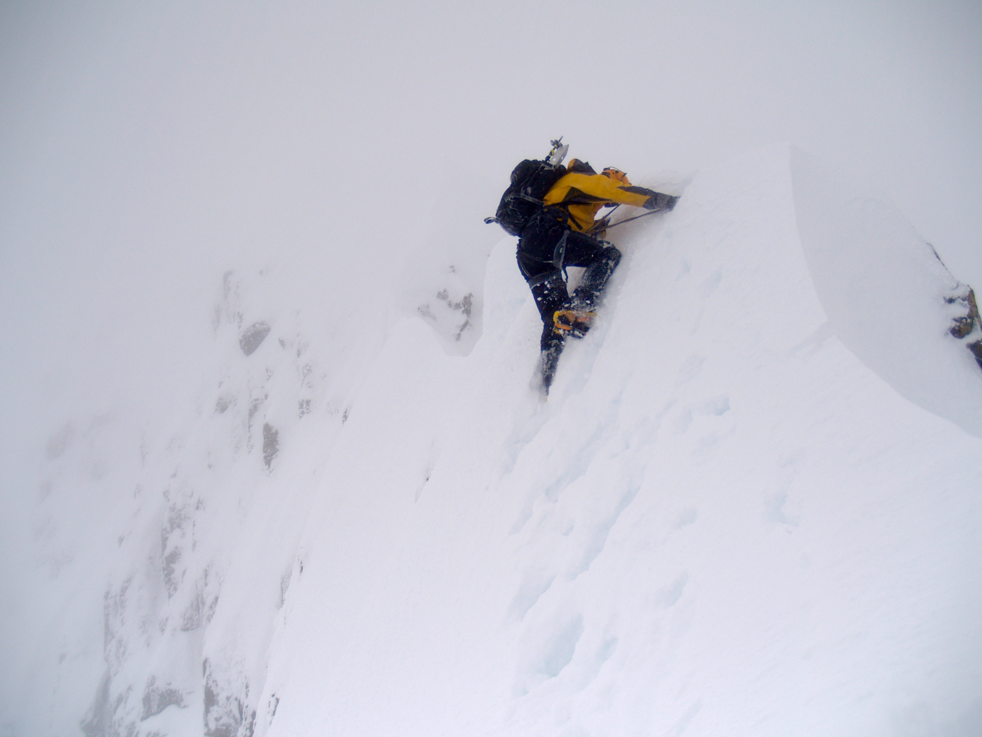 The ridge became much more technical as we navigated steep icy sections and gullies. My semi rigid boots were not ideal for front pointing and a lot of pain was inflicted on the achiles tendons. Dealing with this distracted me from the sheer drops surrounding us. Having the two ice tools and crampons I felt secure however the thought of how far I would fall if my crampons or ice tools failed was a bit terrifying. You had to make sure each ice tool and crampon point placement was solid and secure, able to hold your weight. It took a lot of concentration. Hamish being so helpful cut ledges for me to rest my ankles so they did not fail on me half way up an icy wall. It was tough work.