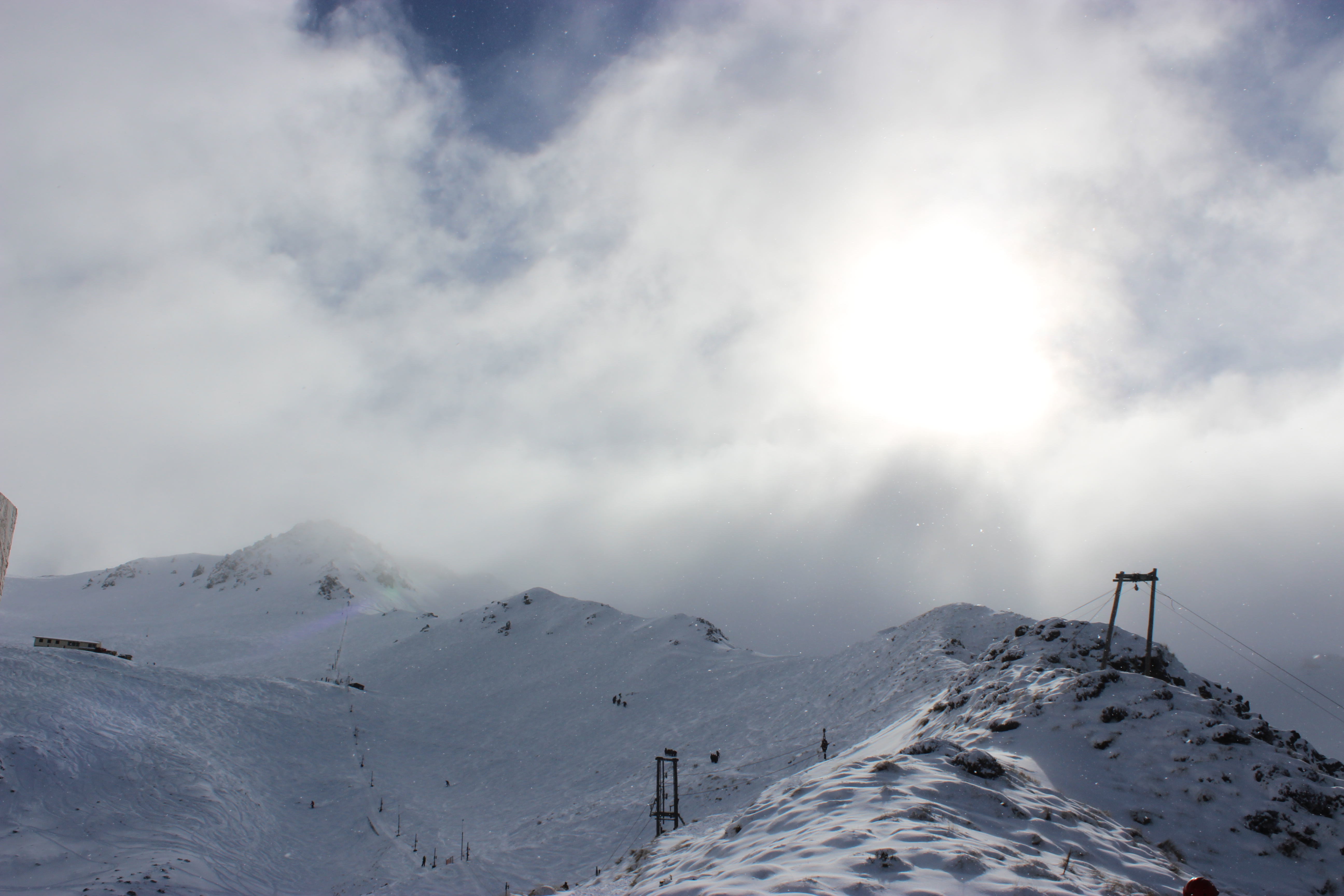 Chains were fitted to Tania’s automonster by the girls (!) while Glen and Guihelm waved at passing cars and tracks. Then, we started crawling up the road followed by the vans. Progress was slow, the road narrow and we cringed every single time when we had to pass a car or get around a very steep hairpin curve. And of course, the car park was full, too. Reversing impossible due to all the snow. Luckily, one skiing party was about to leave and we could steal their parking spot. We still had to fit the three vans in there, though. After one van got stuck in a ditch. It was a mission to get it out. There was a lot of slushy snow and it was rather warm, not exactly ideal for cramponing work and we were like: “Why are we even here?” Yet, we were determined to make the best out of it.