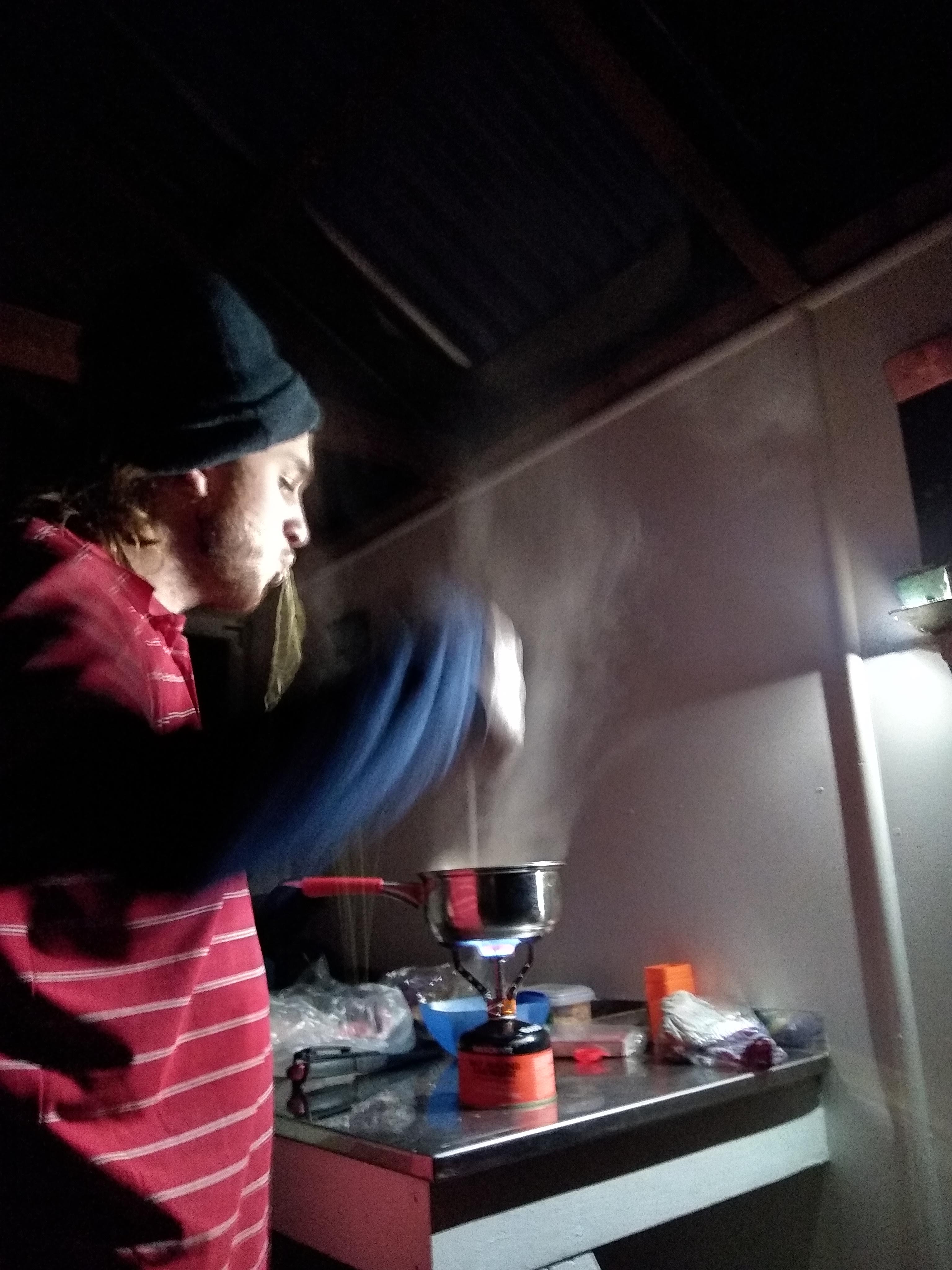 Though the walls were thinner than Hamish’s squashed sandwiches, and the roof lining was more holey than Lewis’s shorts, a roaring fire was soon warming us up beautifully as we prepped our dinners (or sculled a bourbon and coma’d in Blakes case). Aside from Lewis’s onion infused coffee and Hamish’s cooker attempting to provide a reenactment of the Casey Hut fire, all was well as the group overloaded on food and squirmed into their sleeping bags at the scandalous hour of 8pm.