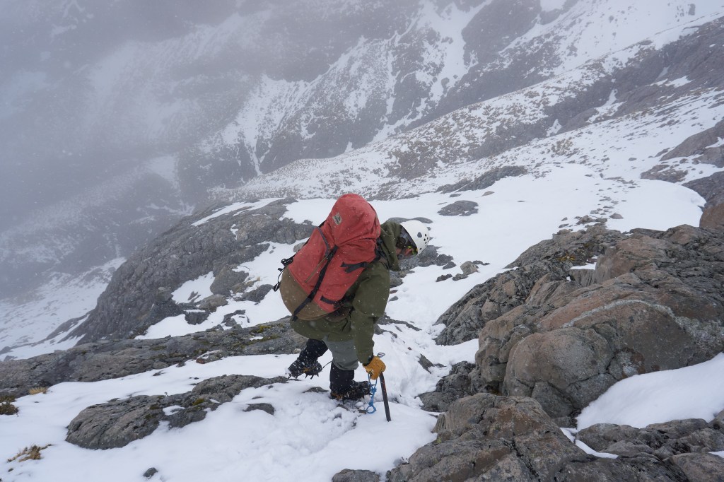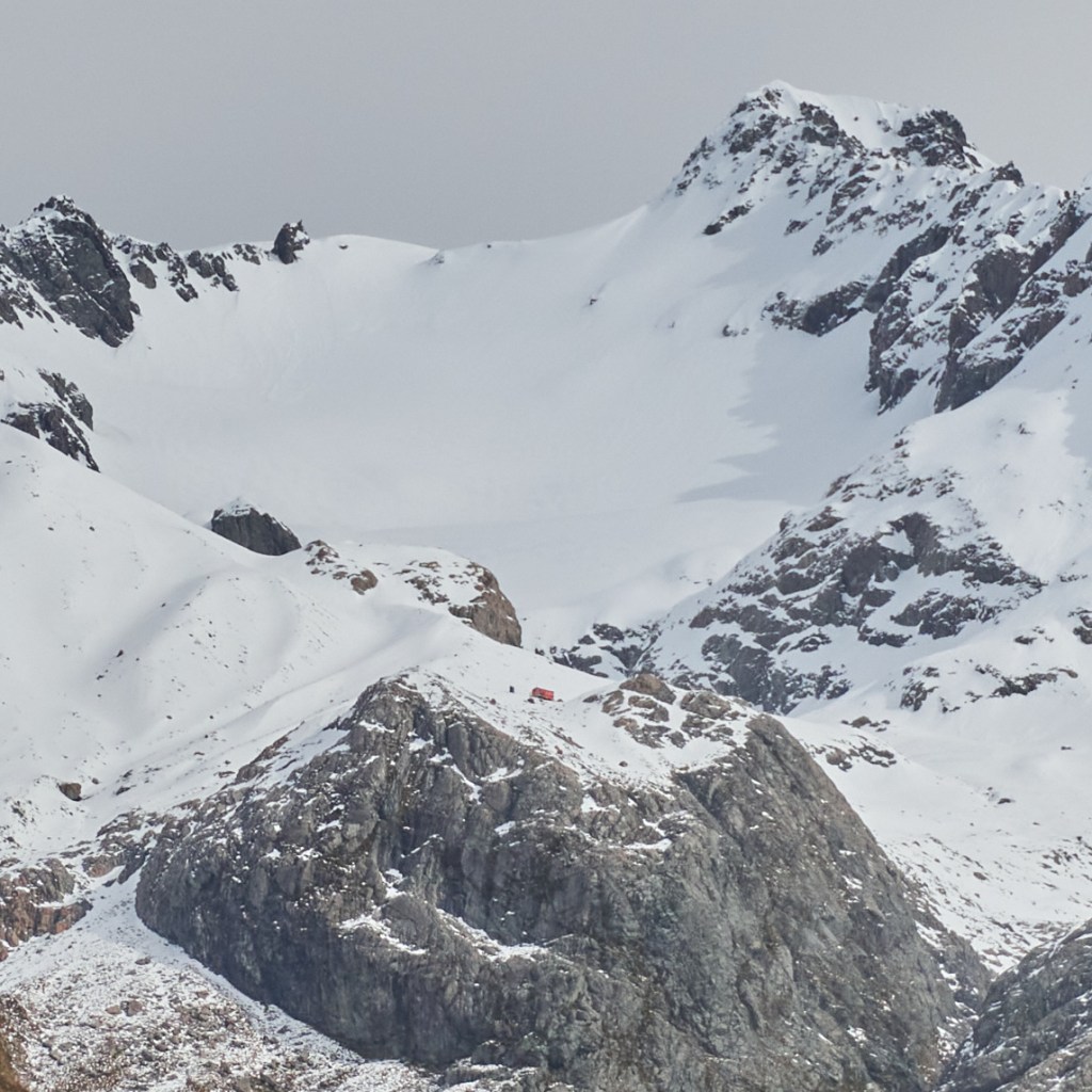The radio forecast confirmed what we already knew about Sunday – rain was forecast, and it wasn’t going to stop all week. So that confirmed that our plan would be to just return back the way we came, so no alpine start and peak-bag this weekend 😦 We were surprised to see clear weather in the morning though, so we went for a wander up the hill behind the hut. Once again, I was blown away by how incredible this place is. The mountains and glaciers are just majestic, and the view of the hut, framed by Mt Rolleston in the distance, was incredible. We got to a rocky outcrop and managed to get a glimpse of the route over the White Glacier to Mt Murchison, just as the cloud came in. And then the weather window was over, and we returned to the hut, playing around in some pockets of windblown powder.