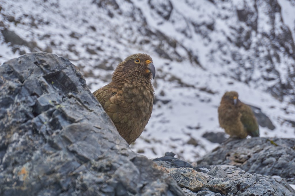 We’d barely made it 5 minutes before we had another visit. You could tell by its yellow eye that this was a different kea though. All of a sudden, 2 more landed and we were surrounded. Once again, the camera came out and we spent a little while (or rather a long while) saying hello and watching the keas tentatively come closer and closer.
