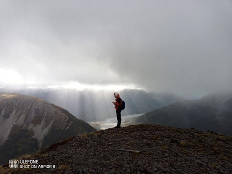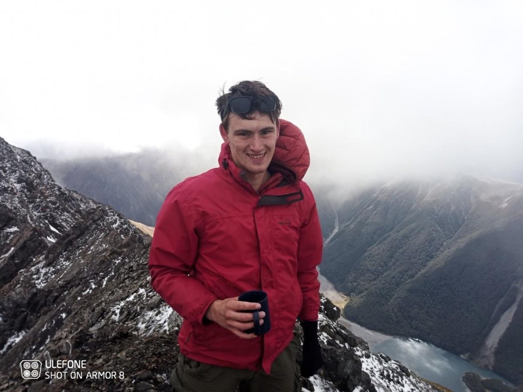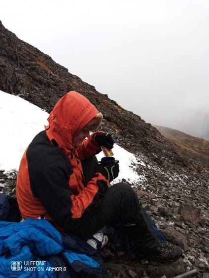 We woke up to the sound of silence which was reassuring as the forecast was for it to be pissing down and we were worried about the cross-ability of the river. Coffee was had, followed by coffee porridge. Ben ate some cheese and we were off. We splashed across the river and staggered up into the bush. We had been preparing for the worst. Thick slippery ground carpeted by dense beech saplings with bush lawyer hanging like barbed wire. Instead we were greeted by the opposite and made great time to the bush line though sparse bush and some dry creek beds. We climbed out onto the tops weaving through some steep bluffs and vaguely following the route description. The wind had picked up. As we started to climb up to the ridge, things got even better with hail. While Ben and I waited for Bennett, I made a slushy with a bit of snow and extra joss. Like Raro snow but with caffeine, i.e. better.
